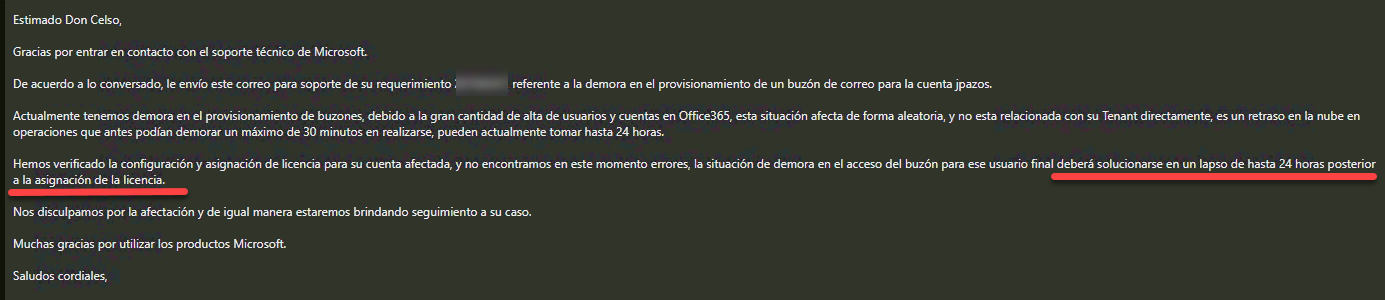 Volviendo al caso, vemos que la cuenta del usuario se encuentra en PendingInput tanto en SharePoint como en Exchange, por lo que si el usuario intenta ingresar a su OWA le mostrará un mensaje de error. Entonces que hacer ¿Que hacer? en estos casos. La respuesta te la dará el Técnico de Microsoft.