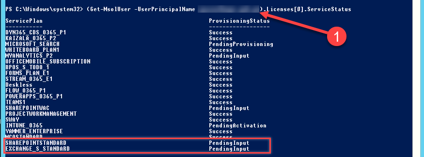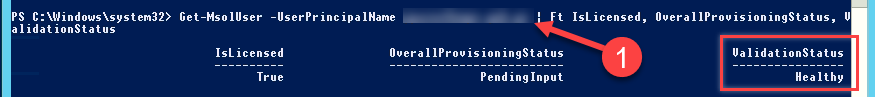 Get-MsolUser -UserPrincipalName usuario@dominio.com | Ft IsLicensed, OverallProvisioningStatus, ValidationStatus