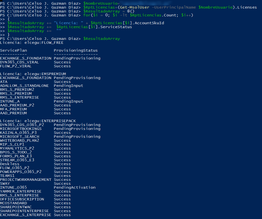 $RptLicencias=(Get-MsolUser -UserPrincipalName $NombreUsuario).Licenses
