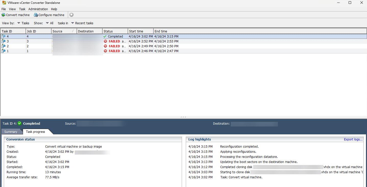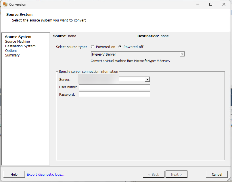 Mi situación actual involucra un host de Hyper-V en Windows Server 2012 R2, del cual necesito convertir y trasladar las máquinas virtuales albergadas hacia un vCenter en su versión 8.0. Para llevar a cabo este proceso, estoy utilizando la herramienta VMware vCenter Converter 6.3.