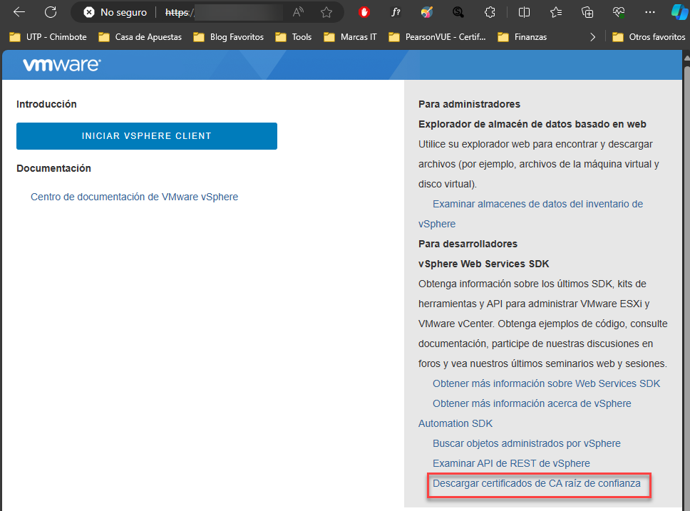 Inmediatamente después de crear la tarea, el error mencionado aparece en cuestión de segundos. ¿Cómo podemos resolverlo? La solución es bastante sencilla: simplemente necesitas descargar el certificado CA del vCenter que tenemos en producción e instalarlo en el host de Hyper-V en Windows Server 2012 R2 como Root de Confiaza.